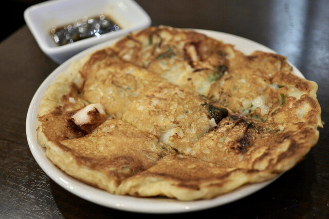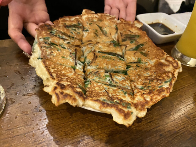 次に海藻チヂミ、ん!分厚いチヂミ⁈もやし入ってもっちりシャキシャキした歯応え!美味しい!!分厚いけどお好み焼きともちがう。海鮮もたっぷり入って、大きさにも大満足✨