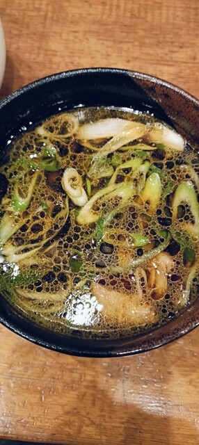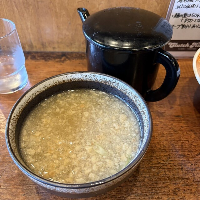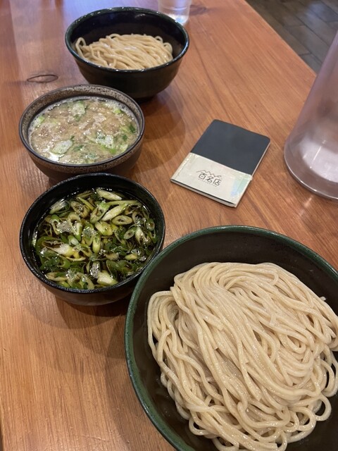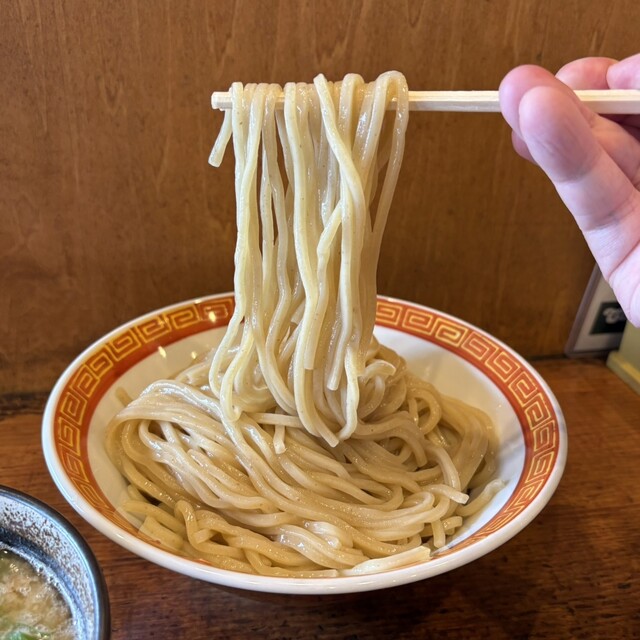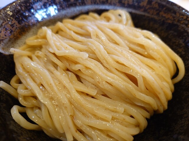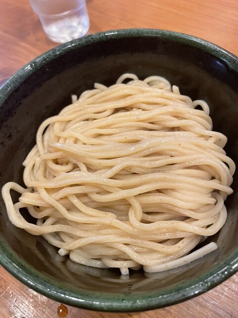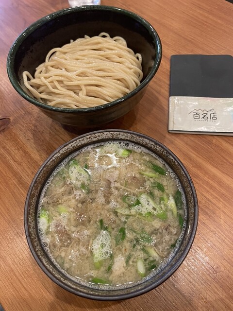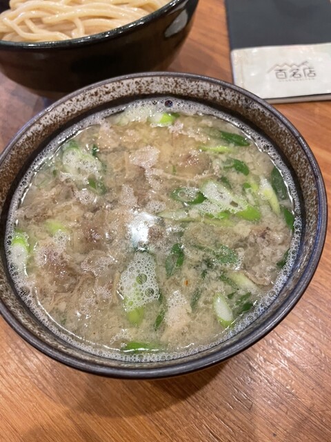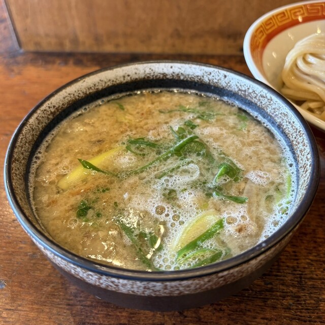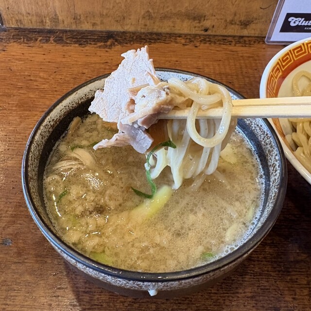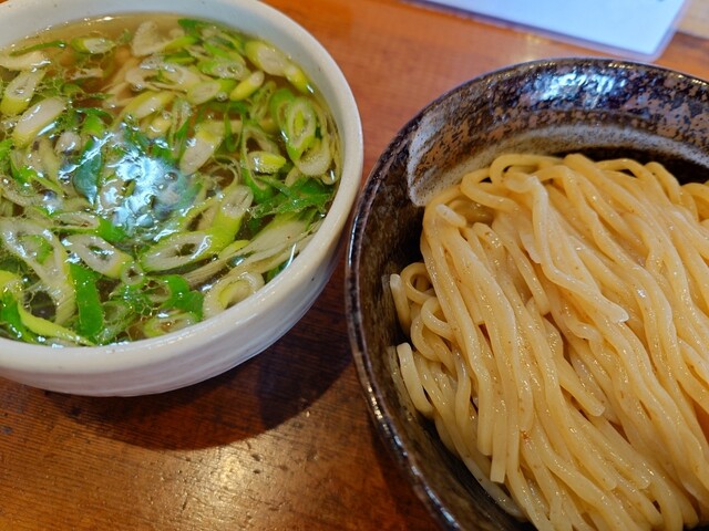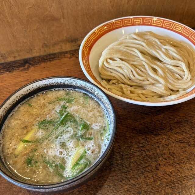 つけ汁は、豚や牛などの動物系に魚介ダシが入ってて塩ダレです。中には、青ネギや大っき目のホルモンやメンマなどが結構入ってて表...