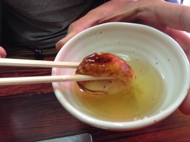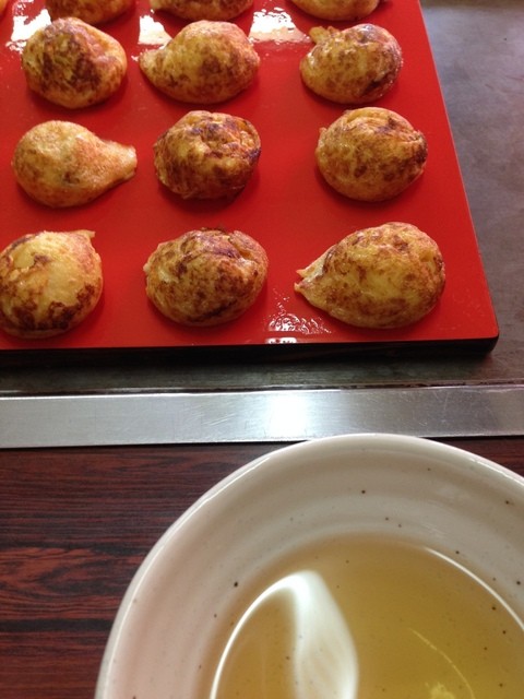 久しぶりに今井に行きました。4時頃なので客は自分達二人だけ、早速、たまご(明石焼き)1枚焼いて・・ いつもどうりのあいその無い感じで焼いてくれて4~5分位で出来上がり、二人でつついて5~6個食べた頃にもう1枚(20個)追加注文、 それが焼きあがって出て来る頃には1枚目が食べ終わってタイミングがいい、地元の旨いもんを食べる幸せを感じながら2枚目も食べ終えた。 この店の味は子供の頃に食べたたまご焼き(...明石焼き)の創始者向井さんの味に似ている 向井さんとの違いはタコ、あの頃はたまご焼きは炭火で焼いていて、 そのすぐ上に湯がいたタコを吊り下げて、必要分だけ切取り、小さく刻んでたまご焼きの中へ入れていた為、 タコが僅か燻された感じになって微妙な味が出ていたのではないかと思います。 食べ方 冷たい出汁に1個いれ半分に割る(ヤケドするので冷ます)7~8個まではこうして皿に口をつけ出汁もすすりながら食べるのが最高