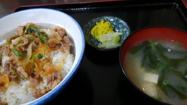 白味噌で、豆腐、わかめ、しゅんだ玉ねぎ、油揚げ、そして青ネギと具沢山。