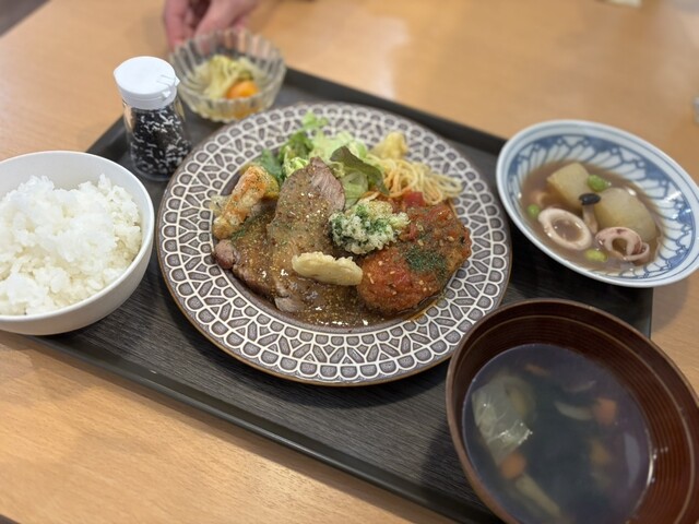 . •ポークカツのせオムドライカレーピラフ Sサイズ 980円 •日替わり定食(A)1360円 ・本日のメイン(ローストポークとカニクリームコロッケトマトソース) ・本日の... 詳細を見る