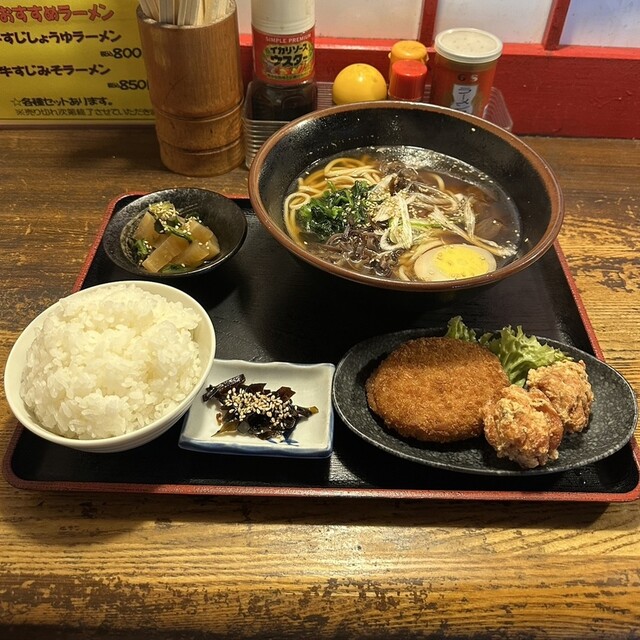 セットメニューの組み合わせ自由自在。 っていうか組み合わせ多すぎ(笑) 迷いに迷って〜ラーメン定食に! ラーメンにコロッケ、唐揚げが付いた欲張りメニュー ラーメンは... 詳細を見る