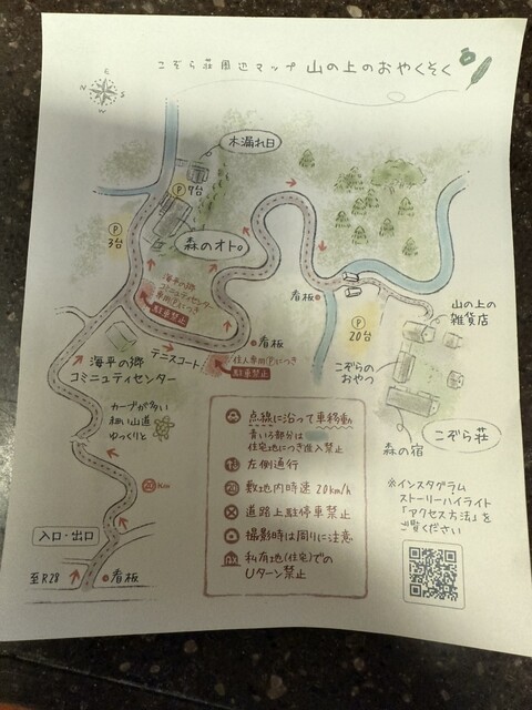 細い山道を登って行きます。10時45分くらいに駐車場に着きました 比較的広い駐車場でしたが、着いた時はガラガラでした。こぞら荘と言う宿泊施設に併設してました。11時からみたいで店の前で待ってましたが、その間に次々と車が駐車場に入ってました。