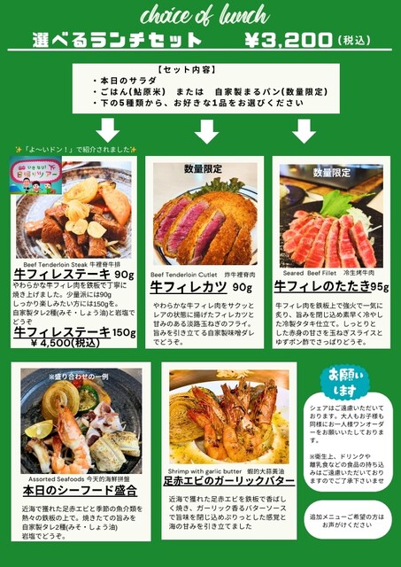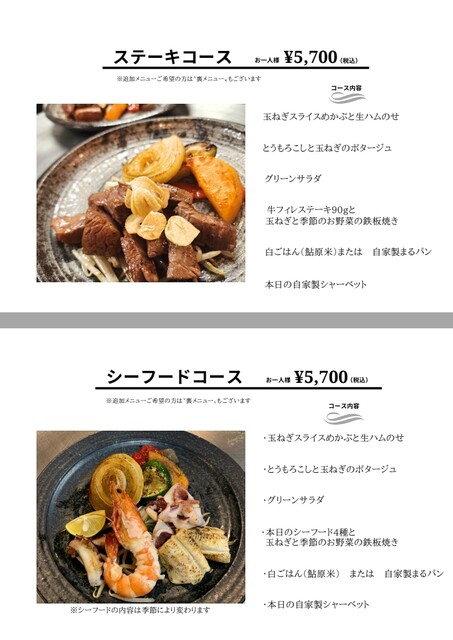 | ジャンル | ステーキ、海鮮、鉄板焼き |