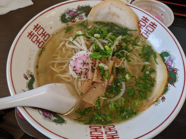 マックスバリュの中にあるお好み焼きやのラーメン。チャーハンのレンゲとラーメンのレンゲが違うのが使ってあります。掬いやすいように。