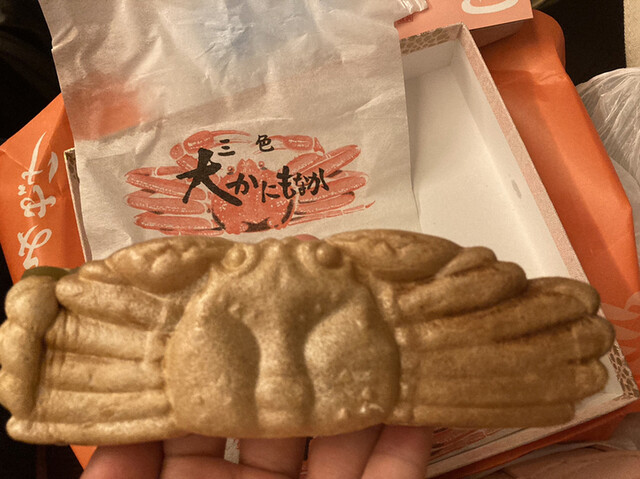 城崎温泉に行った友人からのお土産。日持ちしないけど、ぜひ渡したいと「三色 大かに最中」を届けてくれました。