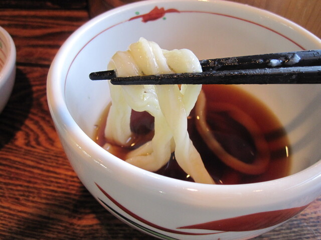 茹で汁と一緒に木製の桶に入ったうどんは、極太且つ長い個性的なフォルム。つゆに浸す際は「つゆが跳ねぬよう、うどんを高く持ち...