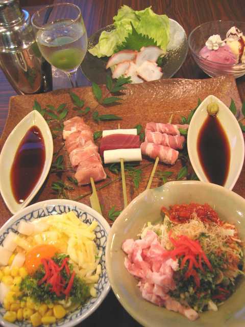 ランチは12時から14時30分まで毎日!いろいろな種類を楽しめるとってもお得なメニューです。夜は串焼きとシェイカーで作る食前酒の付いたお好み焼きともんじゃのセットメニュー。もちろんデザートも付いています。(食前酒はソフトドリンクに変更も出来ます)
