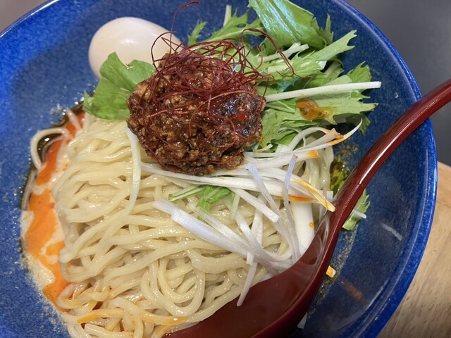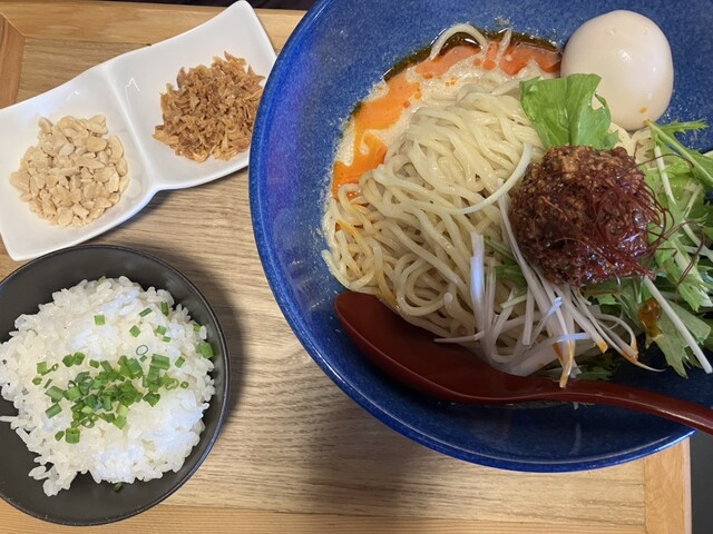 <料理> ■台湾まぜそば(大)…税込1000円 加水率高めの極太麺の上に、台湾ミンチと卵黄、生ニラ、長ネギ、焼海苔、魚粉がのった台湾まぜそば。 大盛り(麺300g)無料なので大盛りで。 さらに追い飯無料なので追い飯もお願いしました。 それと、アプリクーポン特典で無料の「味玉」を追加。 配... 詳細を見る