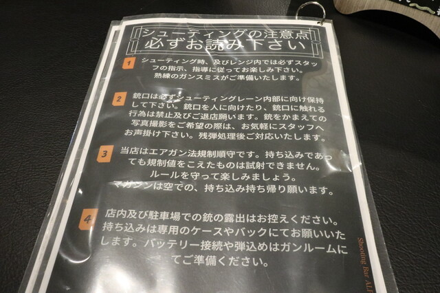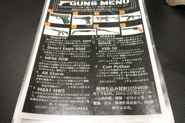撃てるエアガン種類は8種類で値段は1マガジン500円~600円で、エアガンの持ち込みも可能です。