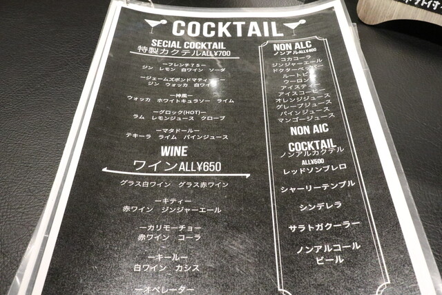 | ドリンク | 焼酎あり、ワインあり、カクテルあり、カクテルにこだわる |