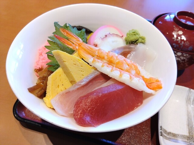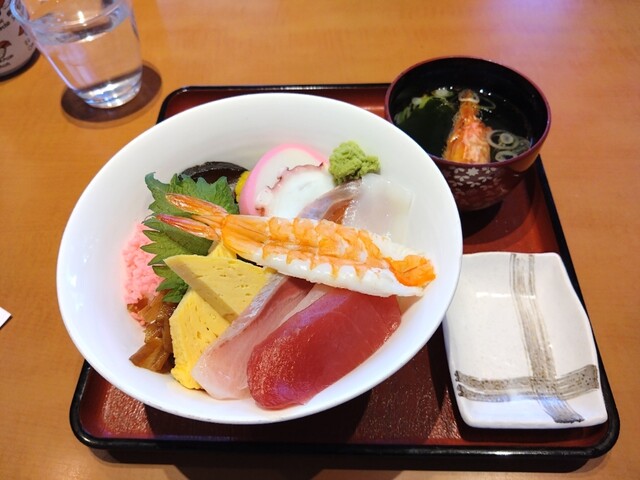 まぐろの赤身、鯛、勘八、サーモン、蒸し海老、タコ、イカ、かまぼこ、玉子、しいたけ、かんひょう、たくあん、でんぶといった内容です。椀には海老の頭が入っていましたが、海老の旨味は感じられず、どうせなら味噌汁の方が良かったかもしれません。