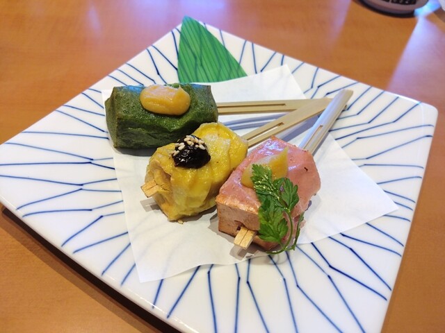 桜(ピンク色)、粟(黄色)、よもぎ(緑色)の3種類の生麩の田楽です。どの生麩も香りがよく、こちらは日本酒が欲しくなりました。