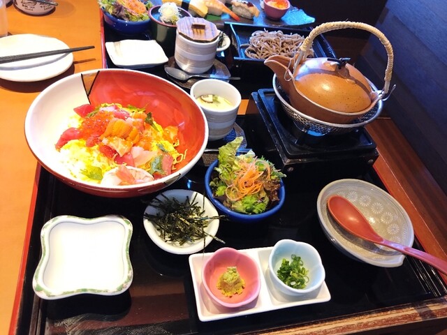 海鮮ひつまぶし丼、サラダ、茶碗蒸し、だし汁、薬味のセット。