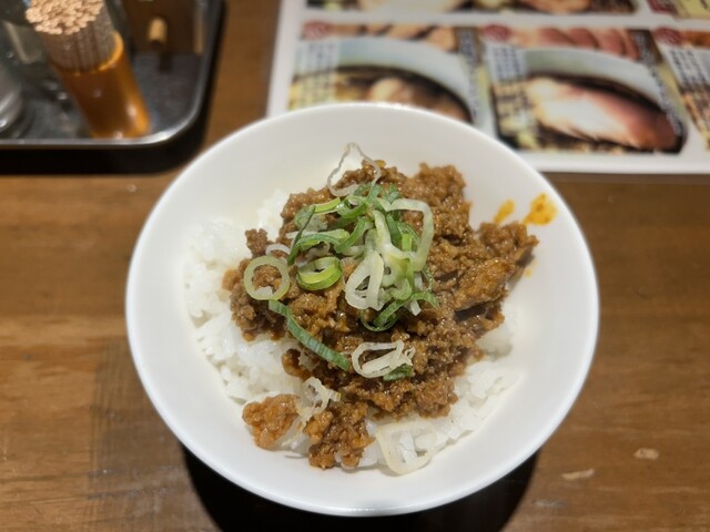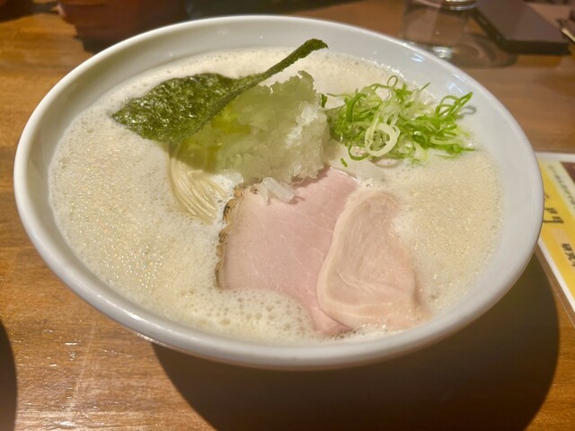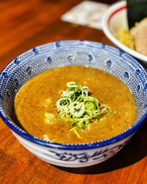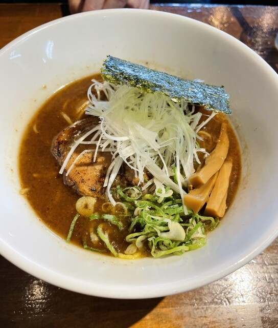 濃厚な鶏白湯のスープに、赤い辣油と挽肉の餡、白髪ネギがバラやローストチャーシュー、細麺と良くあい、大変美...