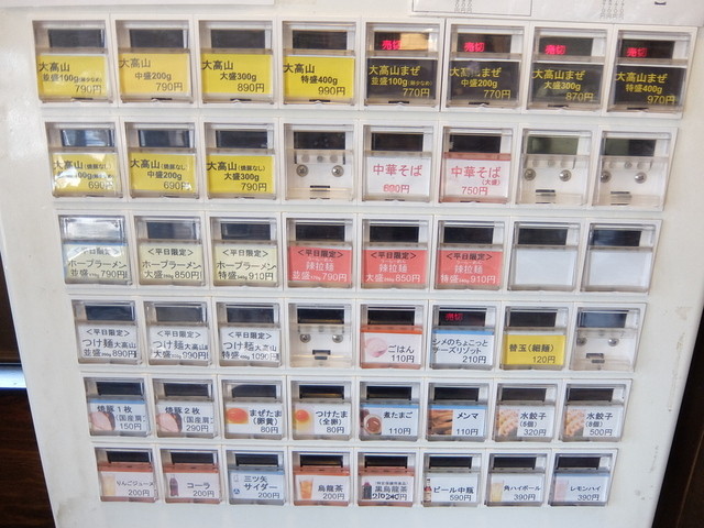 その他、平日限定として、ホープラーメン、辣拉麺、大高山つけめん