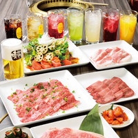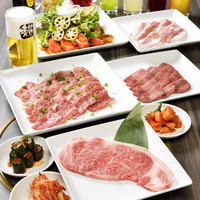 前菜4品(サラダ・ナムル豚軟骨味噌煮込み) 焼肉 上ロース・訳ありカルビ・トントロ・宮崎県産鶏もも・宮崎牛ホルモン グループ全員のコースご注文でライス食べ放題付き。 写真はイメージです。