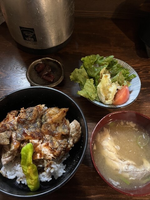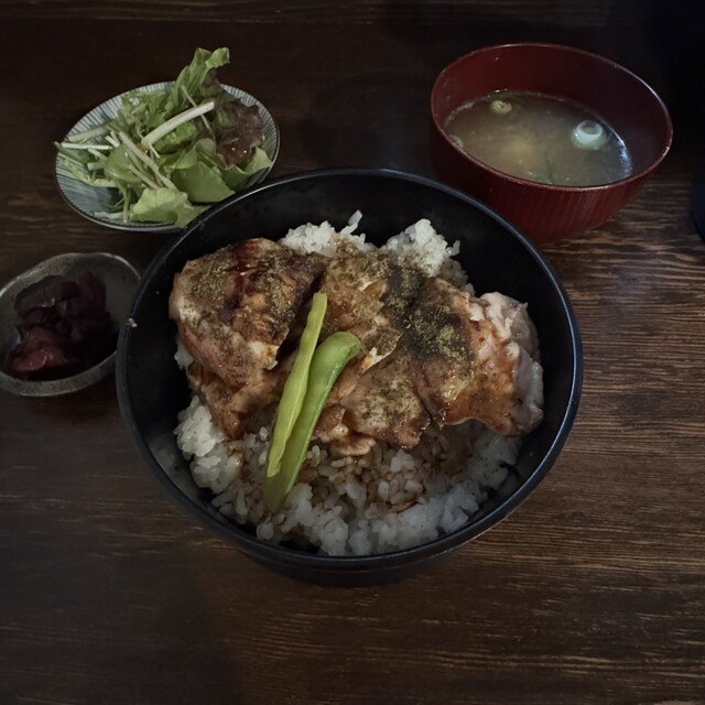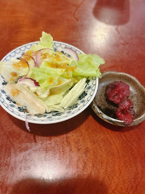 2人での訪問でしたので、私は「鶏もも肉炭火焼き」を選んで、「本日の鮮魚 西京焼き」をシェアで注文する事にしました。15分程で味噌ベースのドレッシングの掛かったサラダが...
