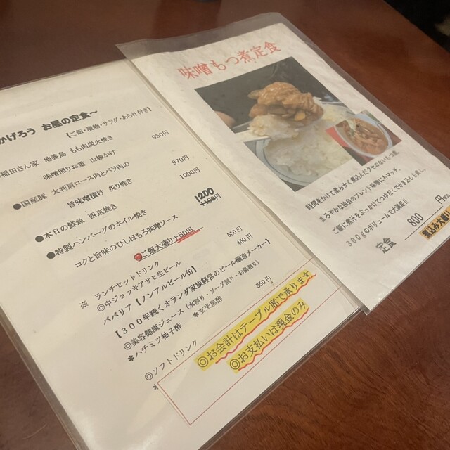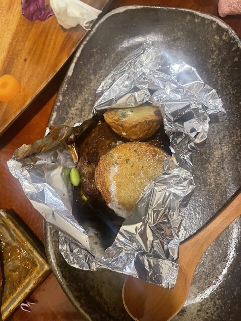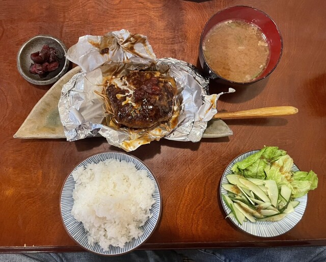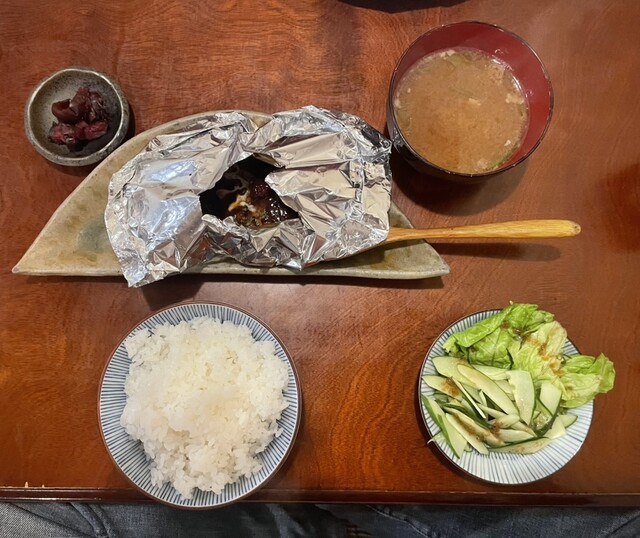 今回はランチタイムに伺い、「特製ハンバーグのホイル焼き コクと旨みのひしほもろみ味噌ソース」と味噌ベースのもつ煮を頼みました。