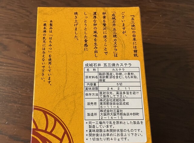 五三焼カステラは卵黄(分量5)を増やして卵白(分量3)を減らし砂糖も増やしたものでより生地のしっとり感を出したもので、高級店でも売ってますが成城石井ものはお手軽なようです。