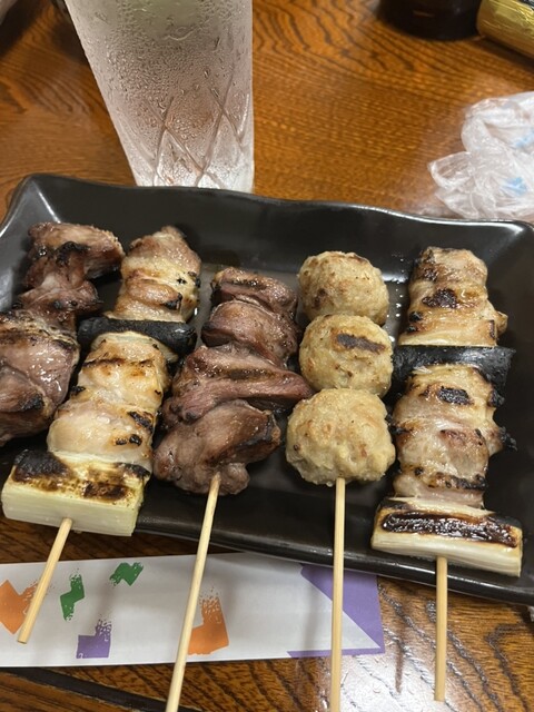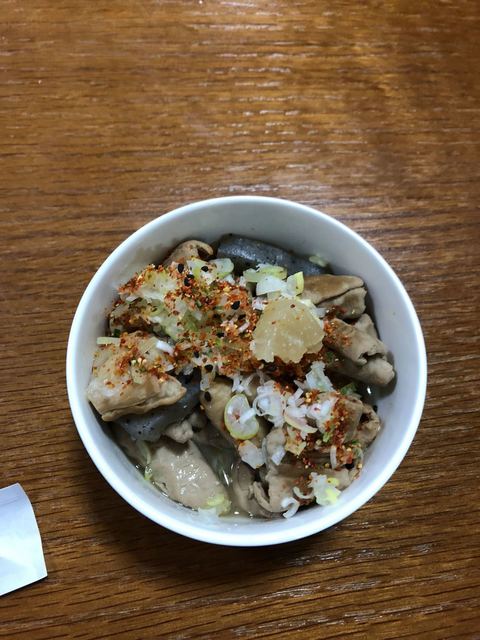御通しはモツ煮。モツが多く、十分に満足できます。焼鳥は全て一本130円。写真はありませんが、一つ一つが大きくボリュームがあります。安いです。子供達も良く食べてくれます。唐揚げのみぞれ煮、エビ春巻、イカゲソ焼、焼そば、オムライスを注文しました。