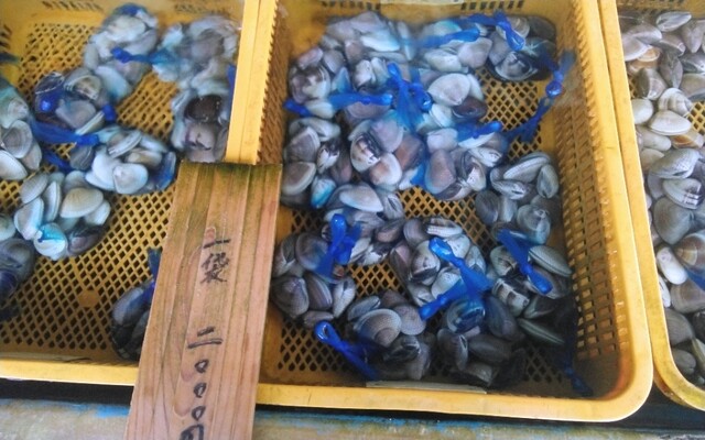 駐車場に車をとめお店に向かう途中水槽があり、そこで蛤が売っています。