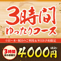 日~木曜日・祝日のご利用&WEB予約限定★ゆったり楽しめる3時間飲み放題付きのコースです♪ ※金曜日、土曜日、年末年始(12/26~1/4)はご利用いただけません。 ※当社お食事券、他値引との併用はできません。 ※一部料理内容が変更になる場合がございます。予めご了承ください。