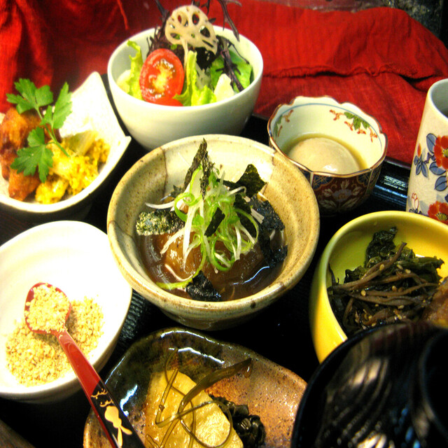 地元の野菜を主に使い、肉・魚介・卵・乳等の動物性素材は一切使わずに、野菜・穀物・海草などの純植物性のみでお料理を組み立てて、おせち料理も県内外に発送しています。研究調理しオリジナル創作料理としてお客様にご提供しております。