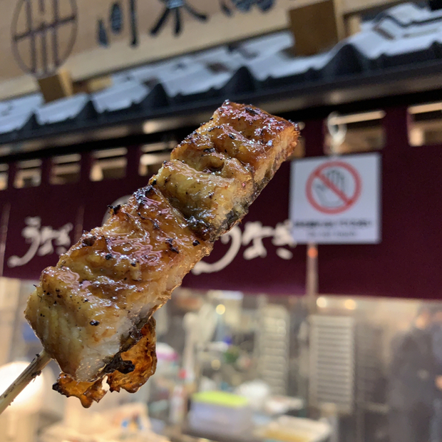 近江町市場での食べ歩きにぴったりの「川木商店」のうなぎ串焼きは、香ばしく焼かれたうなぎが絶品でした!