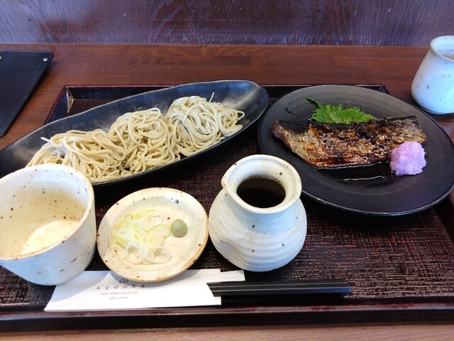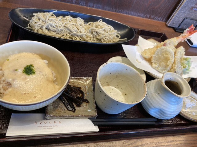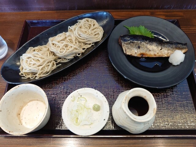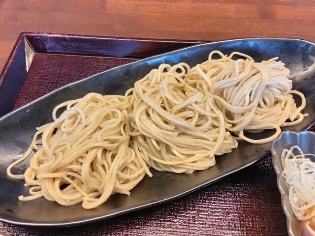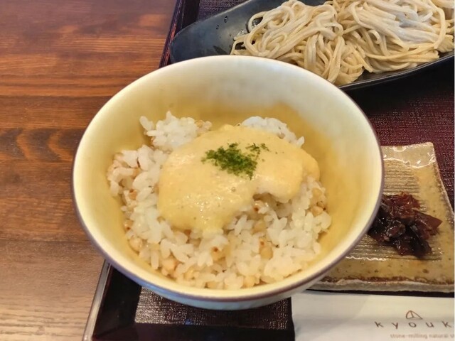 むき実で仕入れる蕎麦は、石臼挽きの手打ち。 歯ごたえ、風味、のどごしの良い細打ち二八蕎麦。 お昼数量限定!「もりそば」に早朝市場から買い付けた新鮮な「お造り三種」と「とろろそば飯」の付いたボリュームのあるセットも大好評。