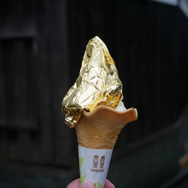 普通のアイスクリーム、金箔は無味なので、写真撮り用に一杯頼むだけでOK。座って食べられるスペースあり、兼六園風の装飾で、どちらもインスタ映えする。