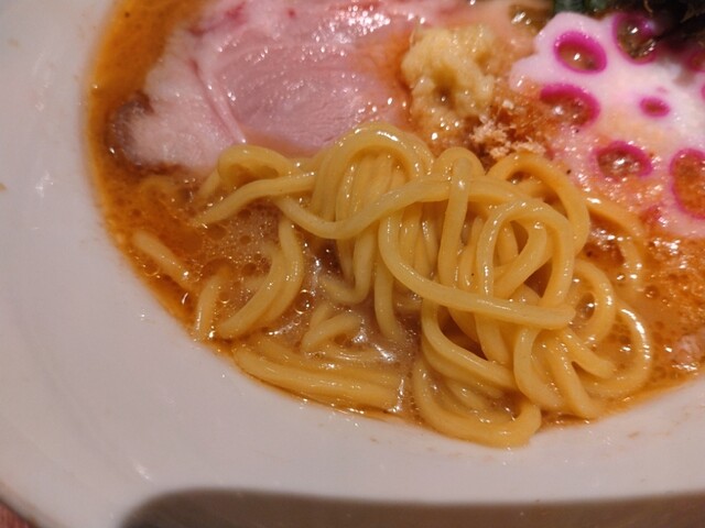 スープのとろみがあるので中太ストレート麺でもスープ...