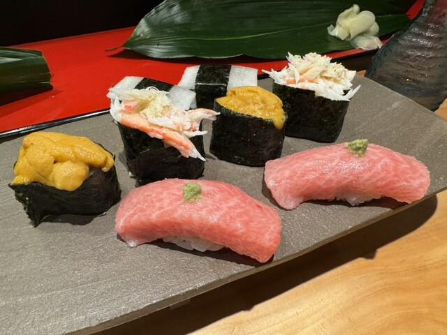 コースは「先付」「お造り」「焼物」「揚物」「季節のお料理」「寿司(上)」という構成になってい...