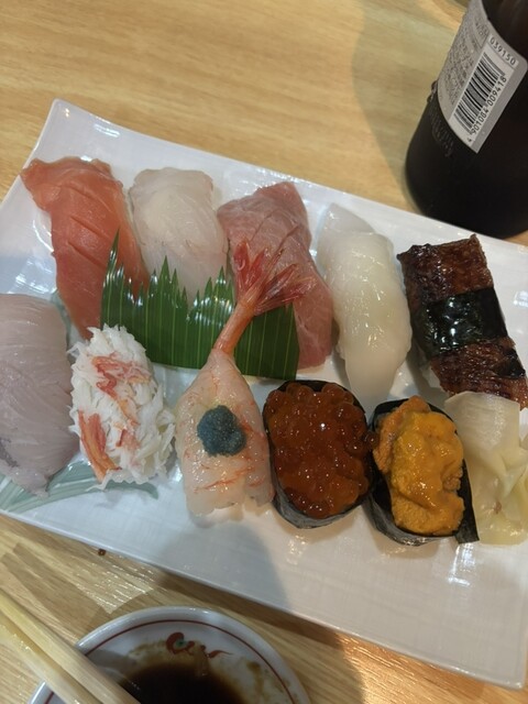 甘海老、いか、うに、いくら、まぐろ、中トロ、穴子、数の子、?の10貫。