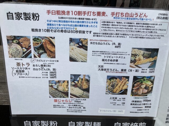 白山山麓の道の駅瀬名の蕎麦山猫がうまいど地元の人に聞いて、一週間前に予約し、日曜日正午に訪問。訪問時点で蕎麦は売り切れです。