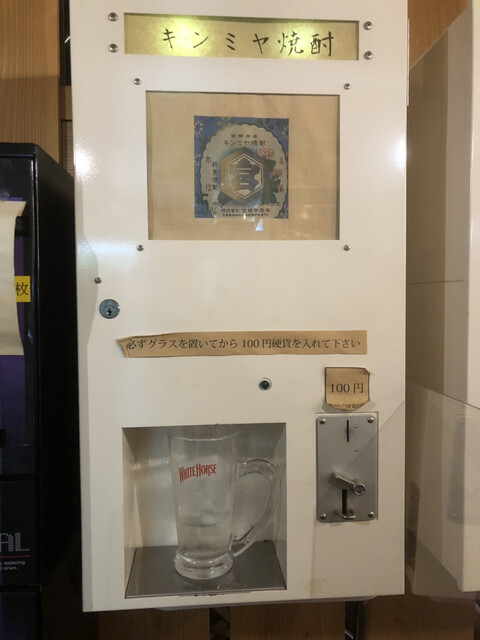 100円の自動販売機で自分でグラスにキンミヤ注ぎ、後ろのカウンターで割材を注文するスタイル!