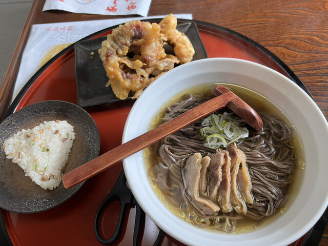 にしました。肉そばは冷たい方で注文、このセットには「かやくおにぎり」が付いています。