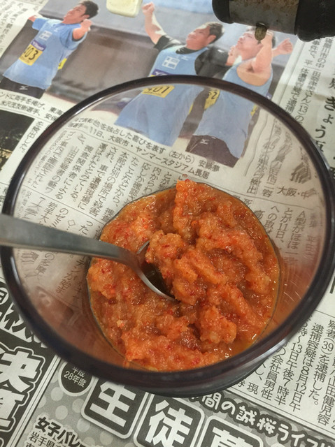 テーブルには新聞紙が敷いてあり、その上に鉄板が置いてあります...