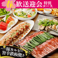メインは、「豚カルビの旨辛鉄板焼き」です。刺身2種盛り合わせ、鶏の唐揚げやお好み焼きもついた全9品♪コスパ抜群の歓送迎会にもピッタリなプランです!勿論、通常の宴会としてもご利用いただけます。