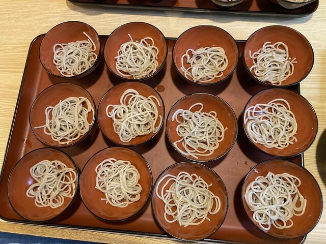 ここでは、わんこそばといっても“盛り出し式”。小さなお椀に一口ずつ盛られた蕎麦がずらりと並び、自分のペースで薬味やつゆを加えながら楽しめます。急かされる感じがないので、のんびり味わいたい人におすすめ。
