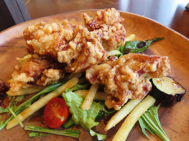 大きな木製プレートに、サニーレタス、水菜、キュウリ、ミニトマト、フライドポテト、のサラダと、素揚げのピーマンとカボチャが一切れずつ。その上に大きな唐揚げが6個。