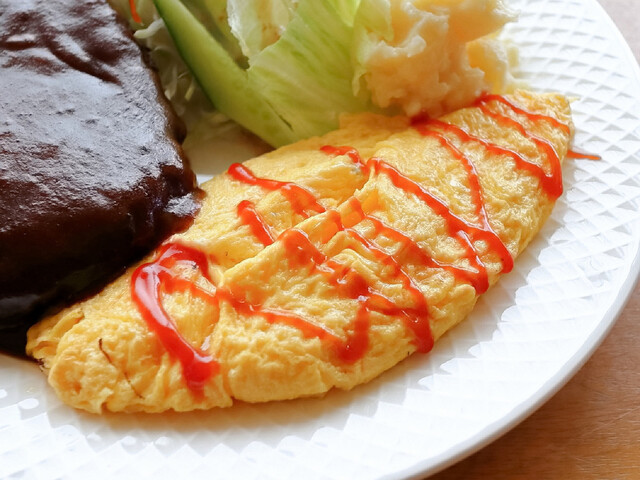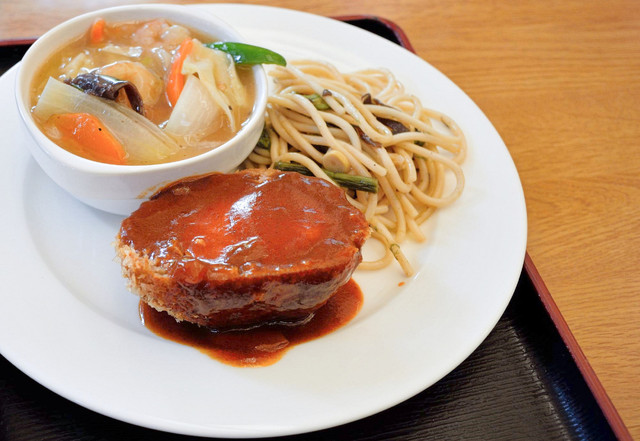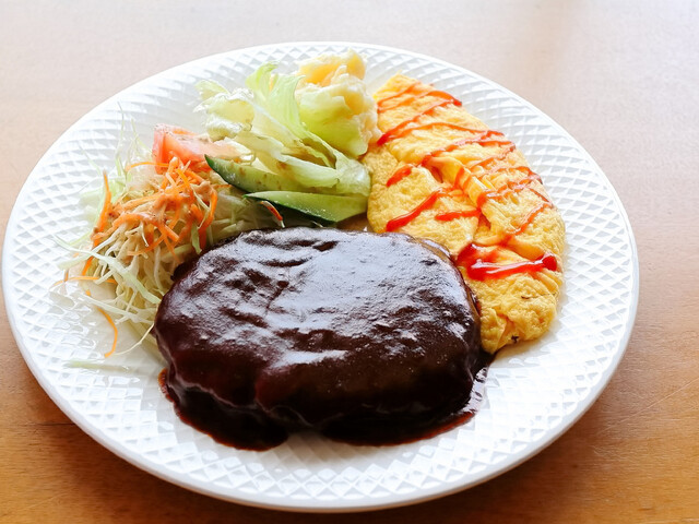 ハンバーグが盛り付けられた皿にはオムレツも一緒に盛り付けてありました。主役のハンバーグと同じくらいの大きさだったので、大きなオムレツに驚きました。ハンバーグはまずまずの厚さで食感が良く、デミ系ソースの味は好みの味で、ライスがすすむ君になりました。オムレツは玉子焼きの数歩手前くらいの仕上がりで、ホテルの朝食に出てくるようなオムレツの仕上がりではありませんでしたが、美味しくいただきました。添え野菜は数種の野菜が盛り付けられ、ポテサラも添えられていました。スープはポタージュスープで美味しかったです。