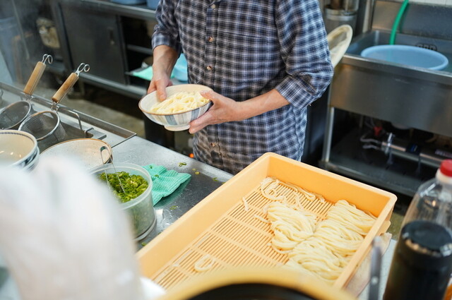 自分の順番になり「ひやあつ」と声をかけます。『ひやあつ』は“少々ぬる目のうどんですが、うどんのコシはしっかりして、当店の看板メニューです。”とあります。