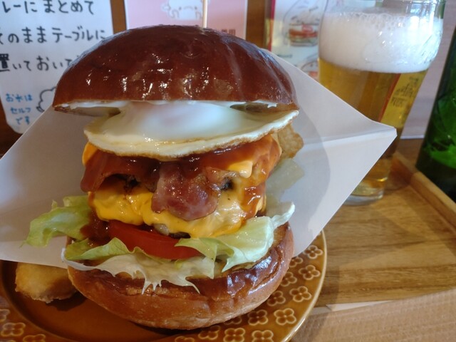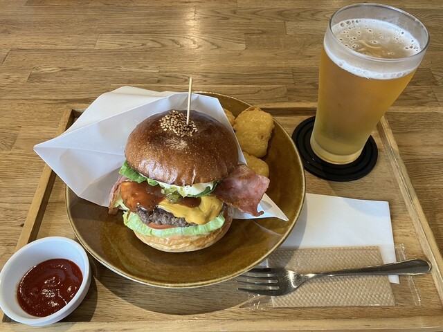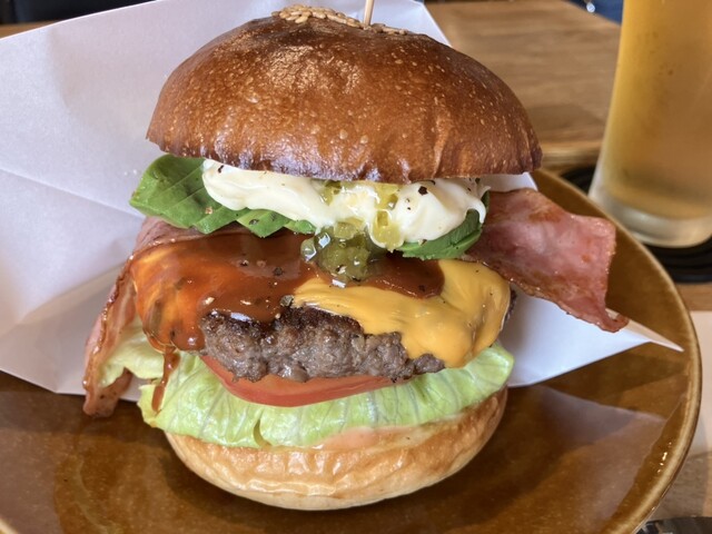 アボカドベーコンチーズバーガー、スーパードライ。