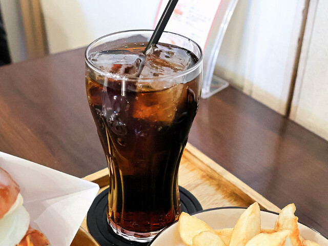 バーガーとドリンクは一緒に登場。バーガーはなかなか高さのあるサイズ感だが、紙が敷かれて串も刺さっているので、包みやすくて食べやすい。