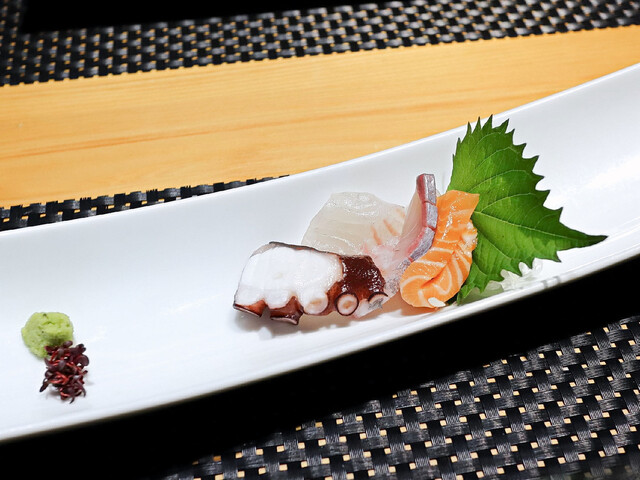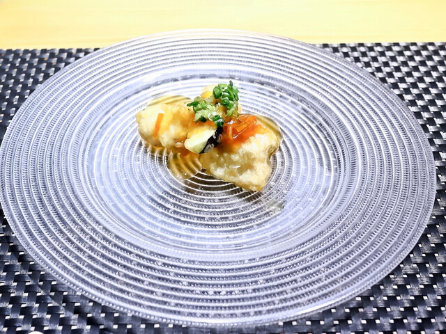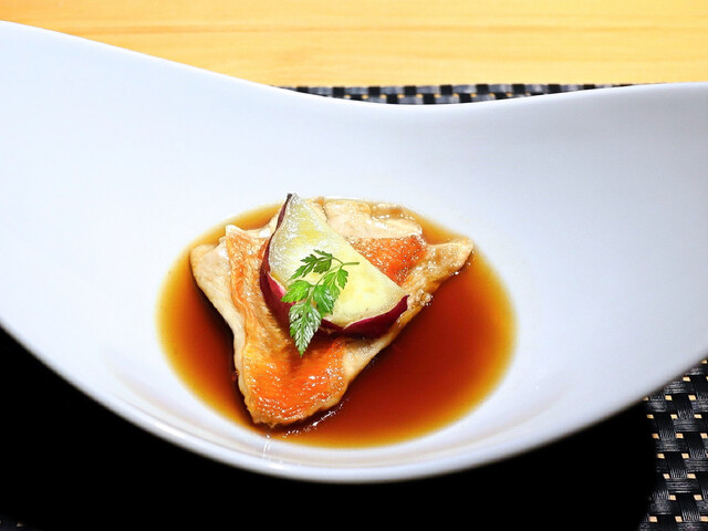 月替わり会席料理をいただきました。内容は、前菜盛合せ、造里、煮物、焼物、揚物、食事、汁物、デザートで、アラカルトメニューからさつま揚げを追加しました。最初に生ビールで乾杯しました。暑い日だったので、いつもより美味しく感じる生ビールでした。その後の酒類の流れは、相方が、生ビール⇒スパークリングワイン⇒白ワイン⇒赤ワインで、私は、生ビーㇽ⇒レモンサワー⇒ウイスキー⇒焼酎を呑みました。前菜盛合せは3種の料理でした。どれも美味しくいただきました。造里はたこ、鯛、ハマチ、サーモンの4種が一切れずつで、会席料理なので少量ずつは普通と思いましたが、やや量が少なく感じました。煮物の欄にスープが入っていたのには驚きましたが、海老ととうもろこしの冷製スープで、コーンの甘味と海老の風味が良く、冷製加減も絶妙で美味しかったです。メニューにはありませんでしたが魚の煮付も出てきました。金目鯛だと思いますが美味しかったです。焼物はオリーブ牛のローストビーフとオリーブ豚で、ローストビーフは程好い食感でソースの味も美味しく、オリーブ豚も美味しく焼けていました。揚物は穴子の甘酢あんかけで、これがとても美味しかったです。食事は和牛ロースといくらの巻き寿司で、相方が美味しいと大絶賛していました。追加したさつま揚げも美味しくいただきました。