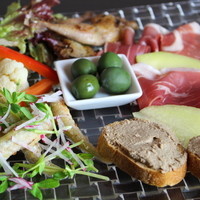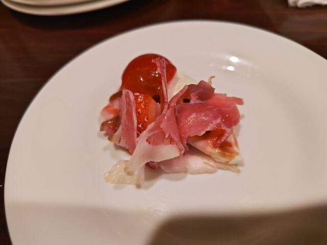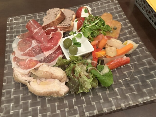 →前菜は、ハモンセラーノ&イチジク、鶏もも肉、フォアグラ w...
