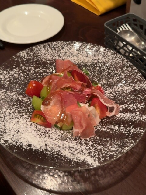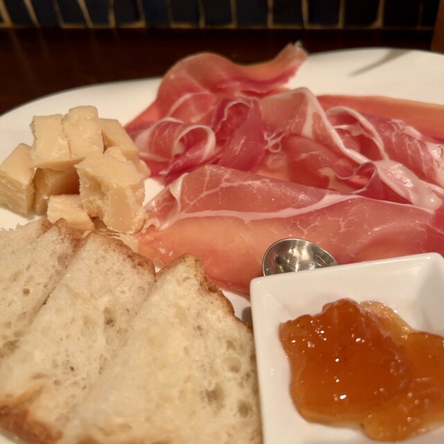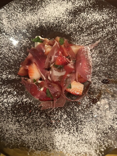 →前菜は、ハモンセラーノ&イチジク、鶏もも肉、フォアグラ w...