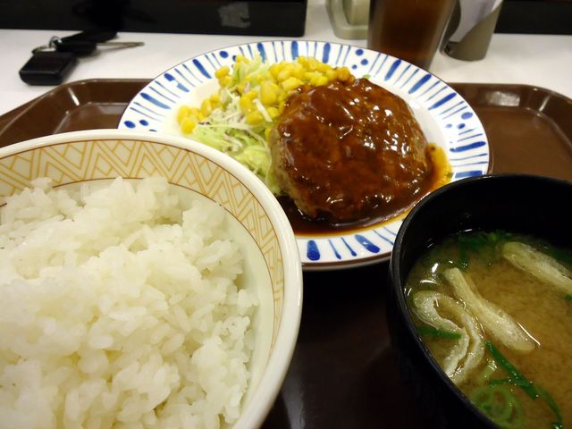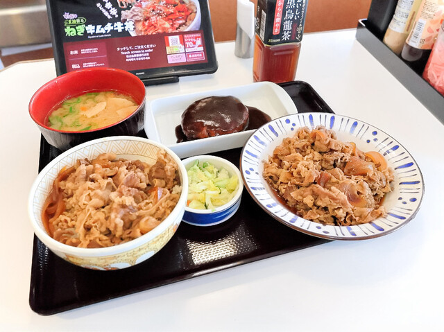 牛丼並盛+おしんこセット、牛皿2倍盛、デミハンバーグをいただきました。おしんこセットの味噌汁をとん汁に変更しました。すき牛に食事に行くことはたまにありますが、牛丼以外のメニューを選ぶことが多く、牛丼をいただくのは久しぶりのように思います。吉牛よりは味が濃く感じるのが私の印象で、今回もそう感じました。牛皿2倍は想像以上に量が多く、すき牛とご飯の配分を気にせずに、しっかりすき牛を味わうことができました。デミハンバーグは期間限定のようで、やわらかな食感のハンバーグが普通に美味しかったです。とん汁は具だくさんで、特に青ねぎのシャキッとした食感が印象的でした。おしんこは良い箸休めになりました。