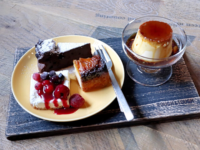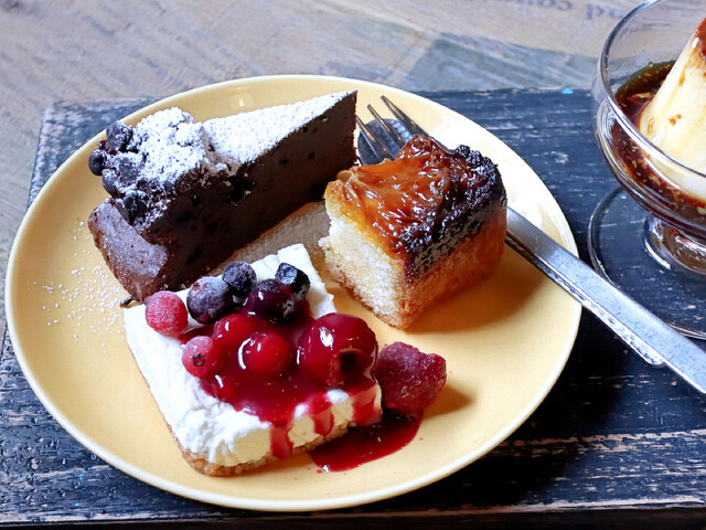 ドライフルーツとナッツのヌガーグラッセは、コーヒーゼリーの上にヌガーグラッセが盛りつててありました。ヌガーグラッセはフランス料理のデザートで食べることはありますが、そうでない時に食べるのは初めてのような気がします。ドライフルーツとナッツがたくさん混ざっていて美味しく、ラムの風味も良かったです。コーヒーゼリーも美味しい味で、ヌガーグラッセと一緒に食べると相性の良さに驚きました。あにばーさりープレートにも満足できました。このプレートは、アニバーサリーの3周年を祝っているそうです。美味しいスイーツが集まったプレートで、デフォスイーツ3種類に選べる1種類が付く嬉しいセットでした。デフォのスイーツはオレンジケーキ、ガトーショコラ、レアチーズケーキで、選べるスイーツは、コーヒーナッツのセミフレッド、ベリーのセミフレッド、カスタードプリンで、2種のセミフレッドはヌガーグラッセがあったのと、プリンが食べたかったのでカスタードプリンを選びました。オレンジケーキはしっとりとした食感でカラメルの風味もあってとても美味しかったです。相方はチョコ系の洋菓子が好物なので、ガトーショコラを美味しそうに食べていました。レアチーズケーキはフランボワーズソースがかかっていて、チーズと甘酸っぱいソースの味が絶妙な美味しさをだしていました。カスタードプリンは好みにぴったりの仕上がりで、味も食感も大満足でした。アイスコーヒーも美味しい味で、量が多めだったのでゆっくり味わうことができました。